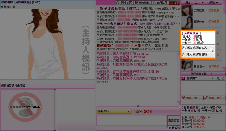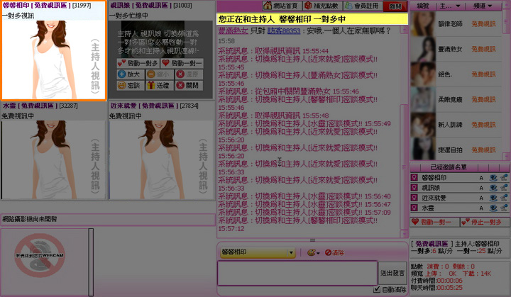 電話付費提示視窗自動關閉後,您就可以跟主持人聊天了,此時主持人的狀態會切換為一對多視訊或一對一視訊,並且原本電話付費的區塊會切換成系統提示(如黃色區塊顯示:您正在和主持人 馨馨相印一對多中)